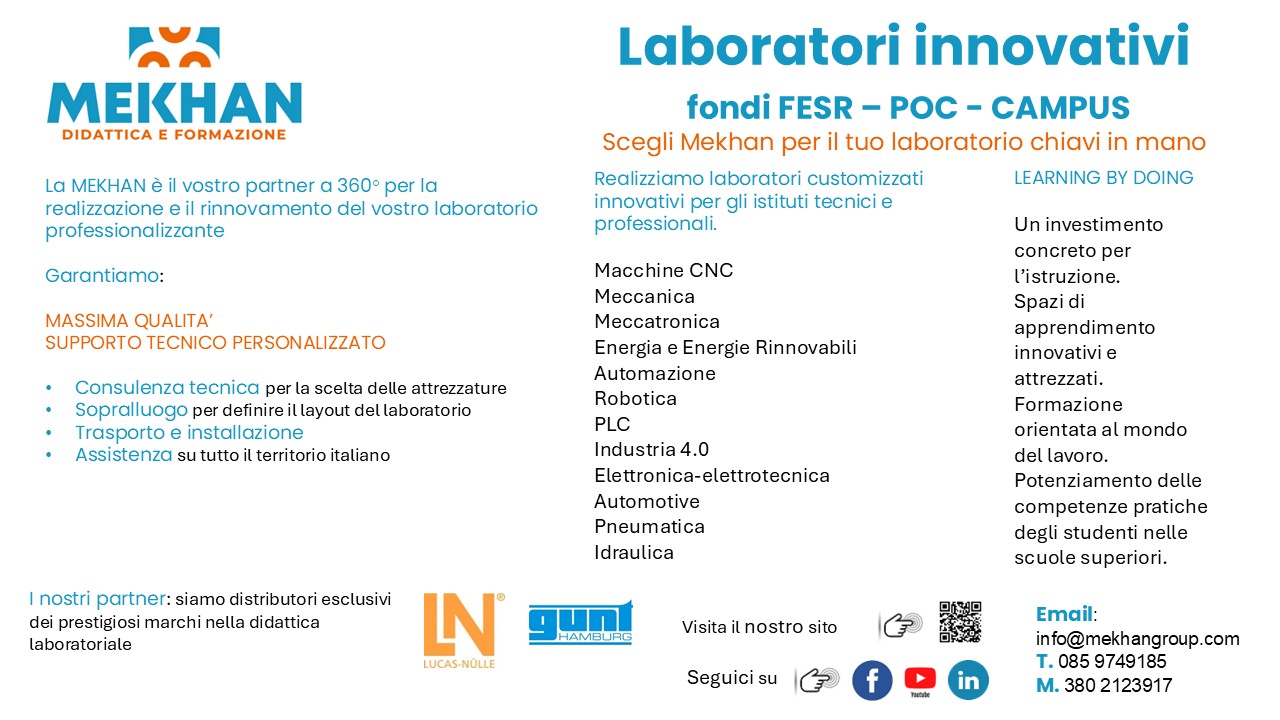 Con la stessa esperienza e professionalità di sempre, promuoviamo anche Laboratori con strumentazioni e macchinari ricondizionati a marchio Mekhan. Ogni laboratorio ha lo scopo di promuovere il “Learning by Doing”, cioè imparare facendo. Gli studenti saranno seguiti e controllati per tutto il percorso di apprendimento.